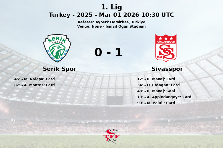 O Sivasspor derrotou o Serik Spor no Estádio Ismail Ogan, em partida válida pela 28ª rodada da 1. Lig Turca, temporada 2025. O único gol da partida, marcado por R. Manaj aos 48 minutos, com assistência de J. Okoronkwo, foi suficiente para o Sivasspor garantir os três pontos.