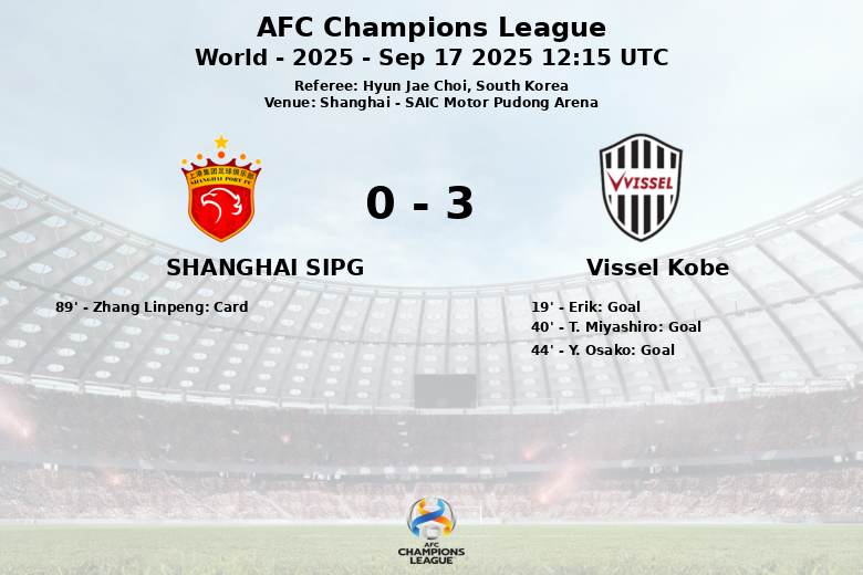 Xangai, China – Em partida válida pela Liga dos Campeões da AFC, o Vissel Kobe demonstrou sua superioridade ao vencer o SHANGHAI SIPG em seu próprio campo, o SAIC Motor Pudong Arena. Desde o apito inicial, a equipe japonesa impôs seu ritmo, refletido na posse de bola de 54%. O primeiro gol surgiu aos 19 minutos, cortesia de Erik, com uma assistência precisa de Y. Osako. A ofensiva do Vissel Kobe não parou por aí, e aos 40 minutos, T. Miyashiro ampliou a vantagem com outro gol, desta vez assistido por Erik. Antes do intervalo, aos 44 minutos, Y. Osako juntou-se à festa dos gols, aproveitando uma assistência de G. Sakai para selar um primeiro tempo dominante.