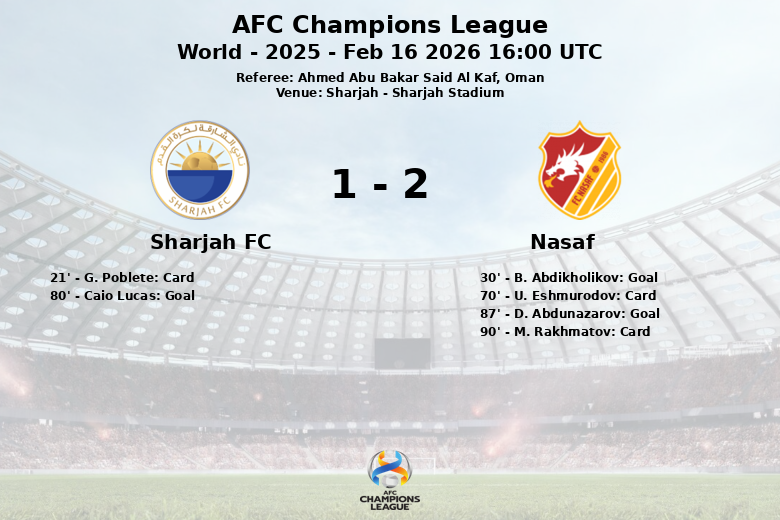 No segundo tempo, o Sharjah FC lutou pelo empate e o encontrou aos 80 minutos, graças a um pênalti convertido por Caio Lucas. No entanto, a alegria da equipe da casa durou pouco, já que D. Abdunazarov colocou o Nasaf à frente novamente aos 87 minutos com um gol assistido por S. Bakhromov.