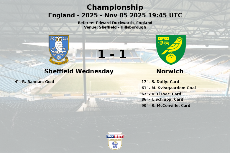 Sheffield, Inglaterra – A partida entre Sheffield Wednesday e Norwich City em Hillsborough terminou em um empate de 1 a 1, em um jogo correspondente à 14ª rodada do Championship. A equipe da casa, Sheffield Wednesday, abriu o placar logo aos 4 minutos com um gol de B. Bannan, assistido por M. Lowe. O gol inicial despertou euforia nas arquibancadas e pareceu ditar o ritmo da partida.