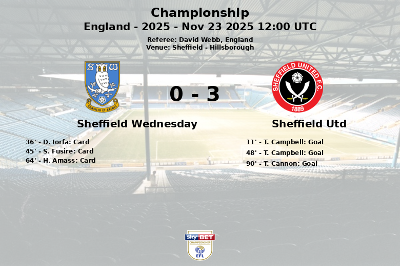 T. Campbell abriu o placar para o Sheffield Utd aos 11 minutos, com assistência de C. O’Hare. Campbell voltou a marcar no início do segundo tempo, aos 48 minutos, desta vez com assistência de S. Peck. O Sheffield Wednesday, apesar de manter 60% de posse de bola, não conseguiu concretizar suas oportunidades em frente ao gol adversário. A equipe da casa acumulou três cartões amarelos durante a partida. O golpe final veio aos 90 minutos, quando T. Cannon selou a partida com o terceiro gol do Sheffield Utd, sem assistência.