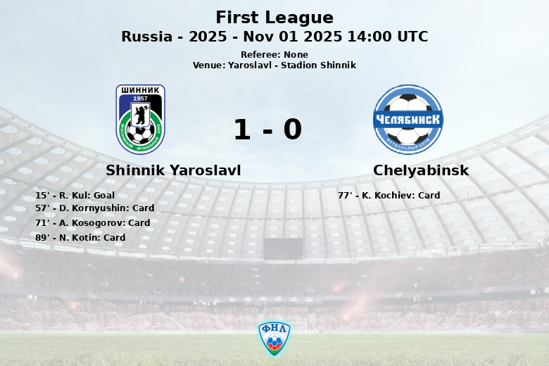 A partida, parte da temporada de 2025, foi intensa e disputada. O Shinnik Yaroslavl recebeu dois cartões amarelos (D. Kornyushin aos 57′ e A. Kosogorov aos 71′ e N. Kotin aos 89′), enquanto o Chelyabinsk recebeu um (K. Kochiev aos 77′). Apesar da intensidade, nenhuma equipe conseguiu impor totalmente seu jogo.