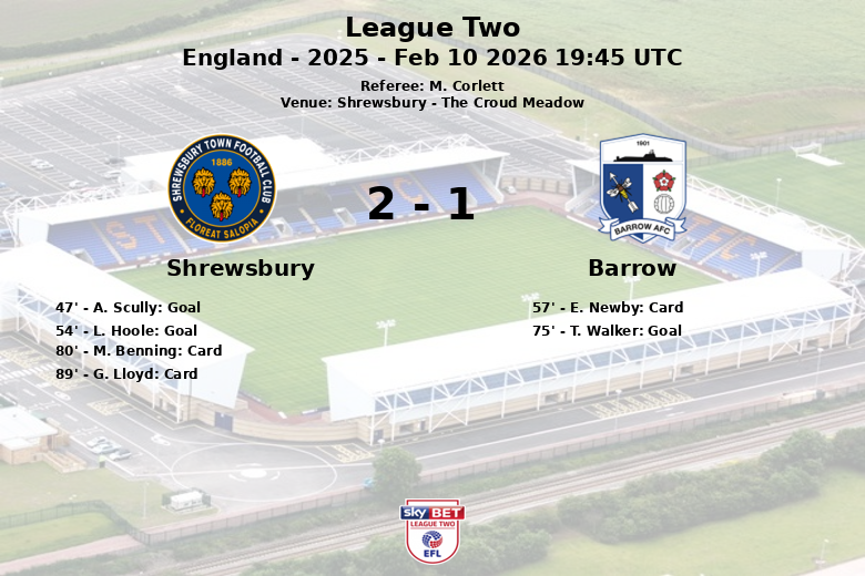 O Shrewsbury garantiu uma vitória em casa contra o Barrow num jogo disputado no The Croud Meadow. Apesar do Barrow ter dominado a posse de bola com 56% contra os 44% do Shrewsbury, a equipa da casa provou ser mais eficaz em frente ao gol. O primeiro gol surgiu logo no início do segundo tempo, aos 47 minutos, com um gol de A. Scully sem assistência. A vantagem foi ampliada aos 54 minutos graças a L. Hoole, que recebeu uma assistência de J. Ruffels.