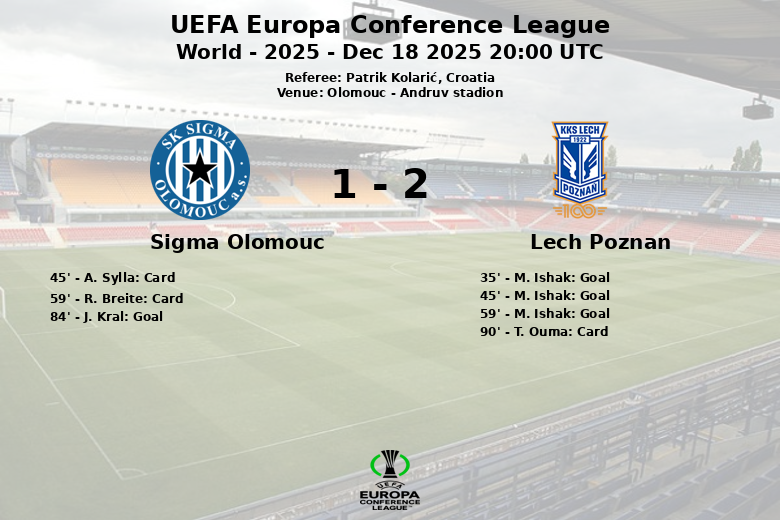 Olomouc, 18 de dezembro de 2025 – Lech Poznan garantiu a vitória em sua visita ao Andruv stadion, derrotando o Sigma Olomouc em uma partida da UEFA Europa Conference League repleta de momentos intensos. A partida, apitada pelo árbitro croata Patrik Kolarić, viu o Lech Poznan dominar a posse de bola com 59%, embora o Sigma Olomouc tenha criado mais oportunidades de gol, com 15 chutes no total em comparação com os 7 do Lech Poznan.