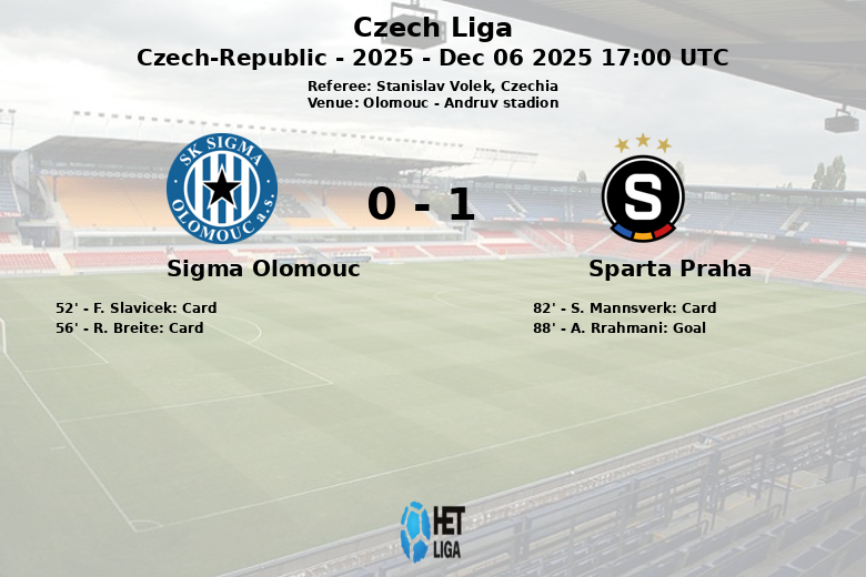 Olomouc – O Sparta Praga conquistou uma vitória apertada na sua visita ao Andruv stadion, casa do Sigma Olomouc, em partida referente à 18ª jornada da Liga Checa. O encontro, disputado sob o olhar atento do árbitro Stanislav Volek, foi marcado por uma clara diferença na posse de bola, com 63% para o Sparta Praga contra 37% do Sigma Olomouc.