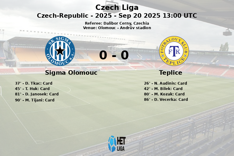 A partida, correspondente à nona rodada da Liga Tcheca, foi repleta de faltas (21 para o Teplice e 17 para o Sigma Olomouc) e cartões amarelos. O árbitro Dalibor Cerny mostrou cinco cartões amarelos para o Teplice (Audinis, Bilek, Kozak, Vecerka) e quatro para o Sigma Olomouc (Tkac, Huk, Janosek, Tijani).