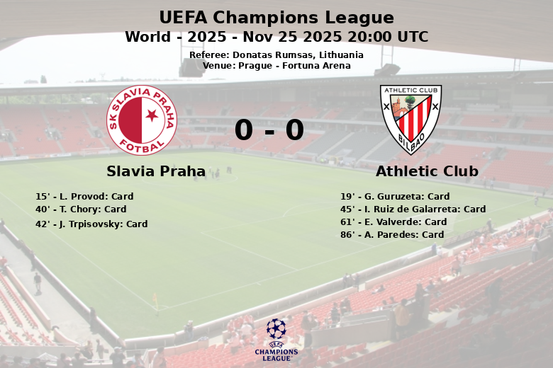 O árbitro lituano Donatas Rumsas teve um trabalho árduo, mostrando numerosos cartões amarelos a ambas as equipas. O Slavia Praga recebeu quatro admoestações (L. Provod, T. Chory, J. Trpisovsky), enquanto o Athletic Club viu três cartões (G. Guruzeta, I. Ruiz de Galarreta, E. Valverde, A. Paredes). O jogo caracterizou-se por um elevado número de faltas cometidas por ambos os conjuntos, 21 por cada lado, o que reflete a intensidade e a luta por cada bola. No final, o jogo foi definido pela paridade e a incapacidade de ambas as equipas em quebrar o empate, deixando a definição do grupo aberta para a próxima jornada.