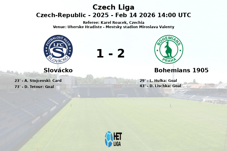 A partida começou em ritmo acelerado, e aos 23 minutos, Stojcevski, do Slovácko, recebeu um cartão amarelo. A alegria chegou para o Bohemians 1905 aos 29 minutos, quando L. Hulka, assistido por A. Cermak, abriu o placar. Antes do final do primeiro tempo, aos 43 minutos, D. Lischka aumentou a vantagem para os visitantes.