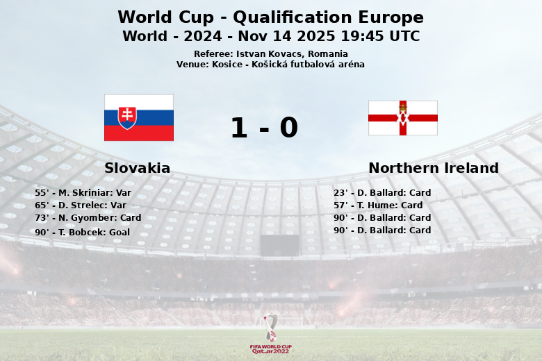 O gol da vitória para a Eslováquia veio aos 90 minutos, marcado por T. Bobcek, com assistência de L. Benes, desencadeando a euforia no estádio. O árbitro romeno Istvan Kovacs conduziu uma partida complicada, marcada pelas intervenções do VAR e pela alta tensão entre as equipes.