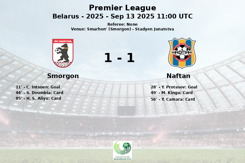 Smarhon’ (Smorgon), Bielorrússia – Uma partida disputada no Stadyen Junatstva viu Smorgon e Naftan empatarem, com um placar final de um gol para cada equipe. O confronto, correspondente à 21ª rodada da Premier League 2025, foi intenso desde o início.