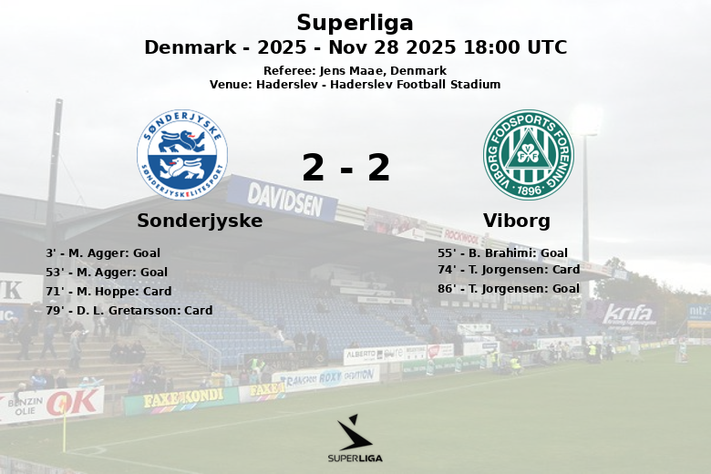 Haderslev, Dinamarca – Em um jogo vibrante disputado no Haderslev Football Stadium, SønderjyskE e Viborg empataram em uma partida da Superliga Dinamarquesa que manteve os torcedores na ponta de seus assentos. Mads Agger brilhou pelo SønderjyskE, marcando dois gols logo no início, aos 3 e 53 minutos, o último com assistência de K.M. Ingason, colocando o time da casa em uma posição favorável.