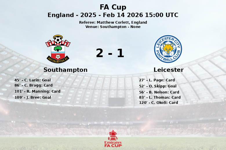 O Southampton abriu o placar aos 45 minutos, graças a um pênalti convertido por C. Larin. O Leicester respondeu no segundo tempo, aos 52 minutos, com um gol de O. Skipp. No entanto, o Southampton voltou a marcar na prorrogação, aos 109 minutos, com um gol de J. Bree.