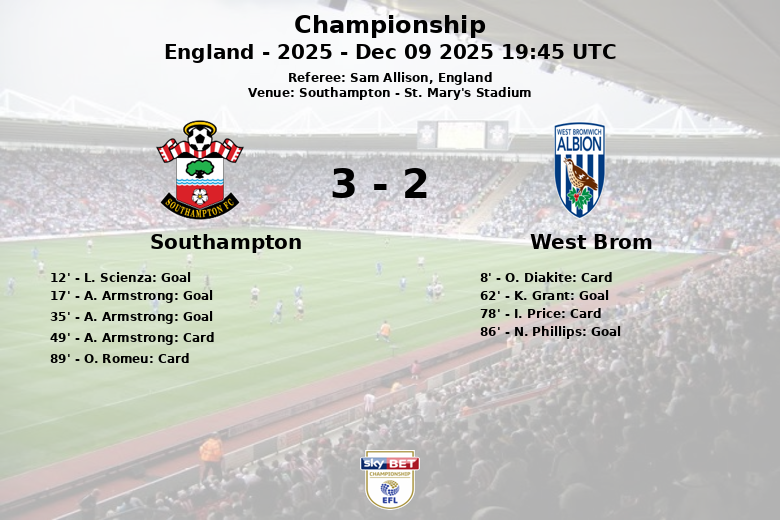 Southampton e West Brom empataram em um jogo cheio de emoções no St. Mary’s Stadium. Os “Saints” assumiram a liderança rapidamente com um gol de L. Scienza aos 12 minutos, assistido por T. Fellows, seguido por dois gols de A. Armstrong aos 17 e 35 minutos, com o segundo gol assistido por F. Azaz. Parecia que o Southampton estava no controle, mas o West Brom não desistiu.