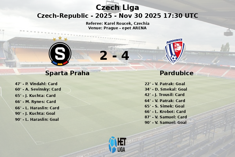 No entanto, a alegria durou pouco para o Sparta Praga, já que V. Samuel do Pardubice selou a vitória de sua equipe com um gol aos 90 minutos, assistido por S. Simek.