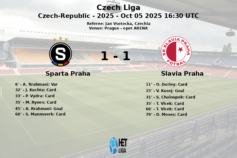 Praga, República Tcheca – Um intenso derby de Praga entre o Sparta Praha e o Slavia Praha terminou em empate, um resultado que reflete a ferocidade e o drama vividos na epet ARENA. O Slavia Praha abriu o placar aos 15 minutos com um gol de V. Kusej, assistido por M. Cham. No entanto, o Sparta Praha conseguiu igualar o marcador pouco antes do intervalo com um gol de A. Rrahmani.
