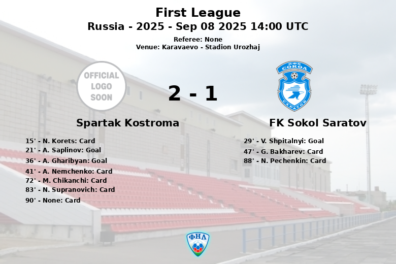 Em uma partida disputada no Stadion Urozhaj em Karavaevo, o Spartak Kostroma garantiu uma vitória apertada sobre o FK Sokol Saratov, com um placar final de 2 a 1. O jogo, correspondente à nona rodada da First League russa, foi marcado por intensidade e jogo físico.