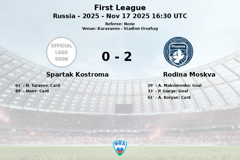 Karavaevo, Rússia – Rodina Moskva derrotou o Spartak Kostroma em um jogo da First League realizado no Stadion Urozhay. Apesar de uma posse de bola equilibrada, Rodina Moskva conseguiu capitalizar suas oportunidades de gol, marcando dois gols no primeiro tempo. A. Maksimenko abriu o placar aos 29 minutos com um gol, seguido por P. Gueye aos 33 minutos, que ampliou a vantagem para o time da casa.