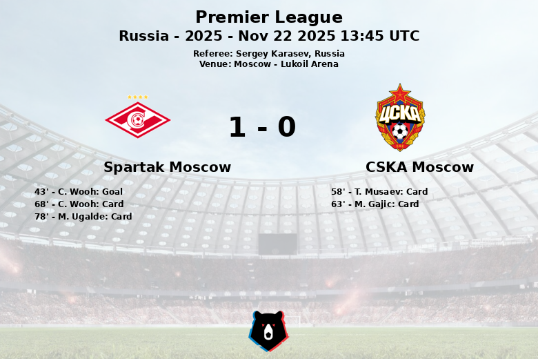 Moscou, Rússia – Em uma partida disputada e tensa, o Spartak Moscou derrotou o CSKA Moscou no derby da capital realizado no Lukoil Arena. A partida, correspondente à 16ª rodada da Premier League Russa, terminou com um placar favorável ao Spartak.