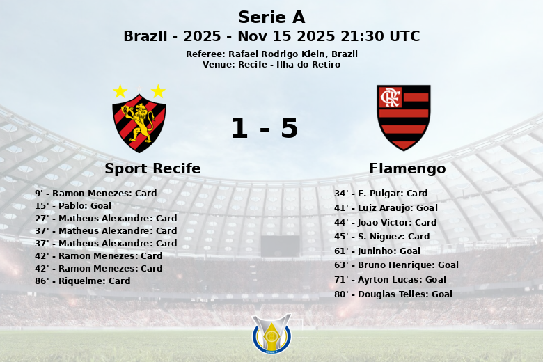 Apesar do Sport Recife ter aberto o placar aos 15 minutos com um gol de Pablo, o Flamengo respondeu com contundência. Luiz Araujo igualou a partida aos 41 minutos, seguido por Juninho aos 61, Bruno Henrique aos 63, Ayrton Lucas aos 71 e Douglas Telles aos 80, selando a vitória para a equipe visitante.