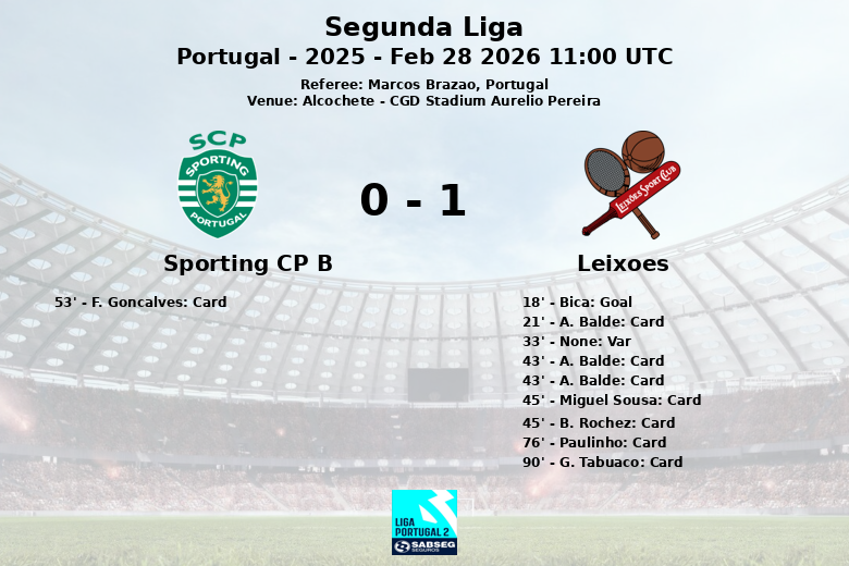 Alcochete, Portugal – Um jogo carregado de emoções e controvérsias aconteceu hoje no CGD Stadium Aurélio Pereira entre Sporting CP B e Leixões, correspondente à 24ª jornada da Segunda Liga portuguesa. O encontro, disputado sob o olhar atento do árbitro Marcos Brazão, foi caracterizado pela alta tensão e inúmeras advertências.