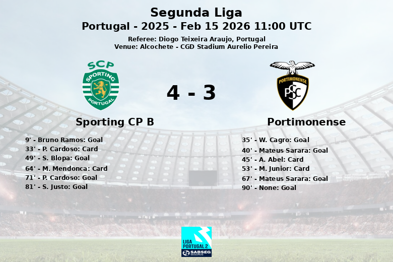 Alcochete, Portugal – Um vibrante encontro da Segunda Liga portuguesa foi vivido hoje no CGD Stadium Aurelio Pereira, onde o Sporting CP B se impôs ao Portimonense em um jogo repleto de gols e alternativas. O árbitro Diogo Teixeira Araujo foi testemunha de um duelo que manteve os torcedores à beira de seus assentos desde o apito inicial.