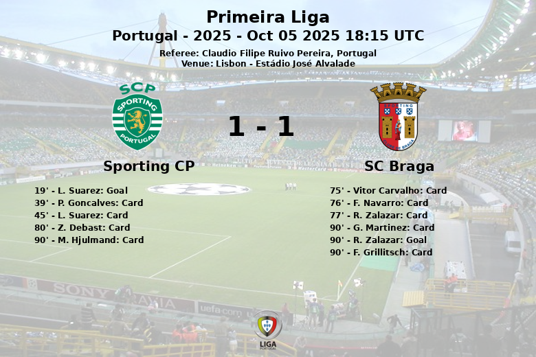 Lisboa, Portugal – Num encontro disputado no Estádio José Alvalade, Sporting CP e SC Braga empataram num jogo marcado pela intensidade e pelos cartões. O Sporting CP adiantou-se no marcador logo aos 19 minutos, graças a um golo de L. Suarez. No entanto, o Braga não desistiu e procurou o empate durante todo o jogo. A partida foi interrompida por vários cartões amarelos, demonstrando a tensão em campo. Finalmente, aos 90 minutos, R. Zalazar converteu uma grande penalidade crucial para o SC Braga, selando o empate.