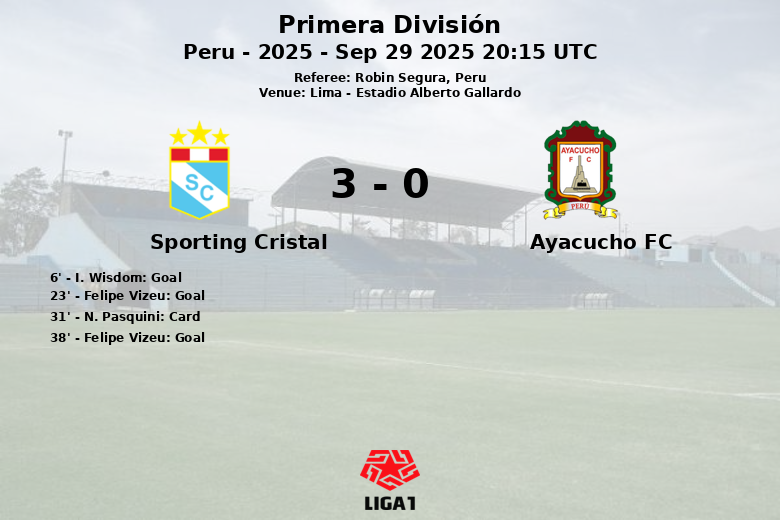 Apesar do cartão amarelo mostrado a N. Pasquini aos 31 minutos, o Sporting Cristal manteve o controle da partida. O Ayacucho FC, com 39% de posse, tentou reagir, mas seus 7 chutes, dos quais apenas 3 foram a gol, não foram suficientes para inquietar a defesa celeste. A partida terminou com um claro domínio do Sporting Cristal, que demonstrou sua solidez tanto no ataque quanto na defesa.