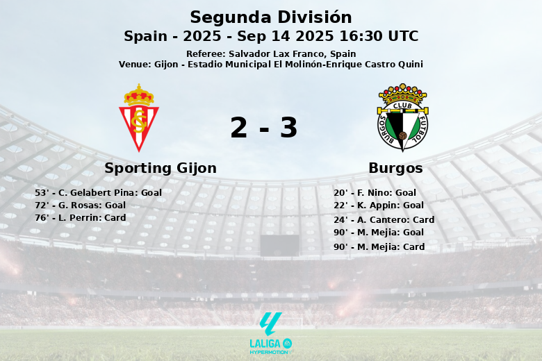 Gijón, 14 de setembro de 2025 – O Estádio Municipal El Molinón-Enrique Castro Quini foi palco de um jogo vibrante entre Sporting Gijón e Burgos, que terminou em um empate de 3-2. O Burgos surpreendeu no início com dois gols rápidos, o primeiro de F. Nino aos 20 minutos, assistido por F. Miguel, e o segundo de K. Appin aos 22 minutos, assistido por I. Morante. A. Cantero do Burgos recebeu um cartão amarelo aos 24 minutos. O Sporting reagiu no segundo tempo, com C. Gelabert Pina marcando aos 53 minutos, assistido por J. Otero, e G. Rosas empatando a partida aos 72 minutos, assistido por J. Dubasin. L. Perrin do Sporting recebeu um cartão amarelo aos 76 minutos. Quando parecia que o jogo terminaria empatado, M. Mejia do Burgos marcou aos 90 minutos, assistido por D. Gonzalez Ballesteros, mas recebeu um cartão amarelo imediatamente após. O jogo terminou com um placar de 3-2 a favor de Burgos. O Burgos teve 48% de posse de bola e fez 10 chutes (5 no alvo), enquanto o Sporting Gijón dominou a posse de bola com 52% e fez 26 chutes (9 no alvo). O árbitro, Salvador Lax Franco, apitou a partida válida pela quinta rodada da Segunda División.