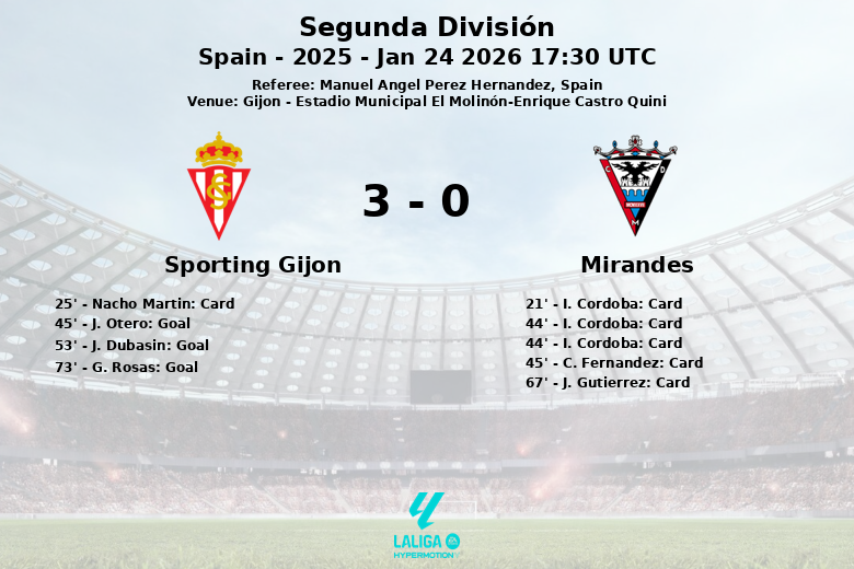 O Mirandés, com menos posse de bola (39%) e um jogador a menos durante grande parte do segundo tempo, lutou mas não conseguiu ameaçar a baliza defendida pelo Sporting. O encontro foi dirigido pelo árbitro Manuel Angel Perez Hernandez. O Sporting Gijón terminou a partida com um total de 16 chutes, dos quais 6 foram ao gol, enquanto o Mirandés conseguiu apenas 2 chutes a gol dos 10 que tentou. O jogo terminou com Sporting Gijón, três Mirandes zero.