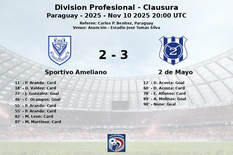 Nos minutos finais, o 2 de Mayo lançou uma ofensiva implacável. A. Molinas diminuiu a diferença aos 89 minutos e, nos acréscimos, um gol agonizante selou a vitória da equipe visitante. A partida foi caracterizada pela alta intensidade no meio-campo, refletida nas numerosas faltas cometidas por ambas as equipes (12 para o Ameliano e 14 para o 2 de Mayo). O Ameliano teve 43% de posse de bola com 6 chutes e 2 chutes a gol, enquanto o 2 de Mayo teve 57% de posse de bola com 13 chutes e 5 chutes a gol. O árbitro Carlos P. Benitez mostrou um total de 7 cartões amarelos (5 para o Ameliano e 2 para o 2 de Mayo) e um cartão vermelho para o Ameliano.