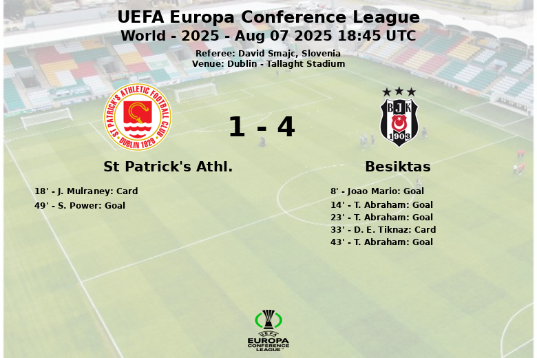 Dublin, Irlanda – O Besiktas demonstrou sua superioridade no Tallaght Stadium ao vencer o St Patrick’s Athletic em uma partida da UEFA Europa Conference League. Desde o início, a equipe turca impôs seu jogo com um Joao Mario brilhante, que assistiu o primeiro gol aos 8 minutos. A estrela da partida foi, sem dúvida, T. Abraham, que marcou um hat-trick, incluindo um gol de pênalti, consolidando a vantagem do Besiktas. O St Patrick’s Athletic, embora tenha lutado e conseguido marcar um gol através de S. Power aos 49 minutos, não conseguiu contrariar o domínio do Besiktas. A equipe irlandesa, com 33% de posse de bola, lutou para criar oportunidades, enquanto o Besiktas controlou o jogo com 67% de posse de bola e gerou múltiplas chances de gol. O árbitro esloveno David Smajc mostrou cartões amarelos para J. Mulraney do St Patrick’s Athletic e D. E. Tiknaz do Besiktas. A partida, correspondente à 3ª Ronda de Qualificação da UEFA Europa Conference League, deixou claro o poderio ofensivo do Besiktas. O resultado final refletiu a disparidade em campo, com o Besiktas levando uma vitória merecida.