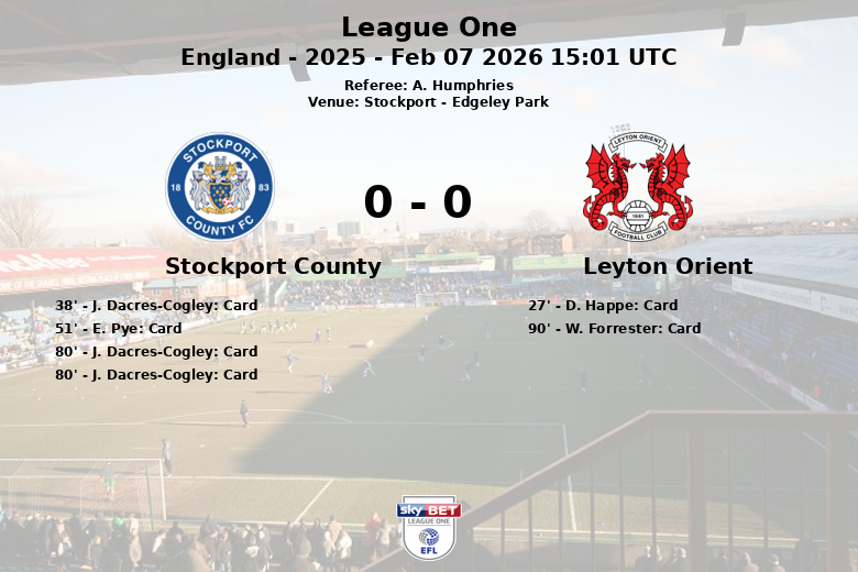 Stockport, Inglaterra – Stockport County e Leyton Orient empataram em 0 a 0 em uma partida disputada no Edgeley Park, marcada pela intensidade e pelos cartões. O árbitro A. Humphries teve uma tarde agitada, mostrando um total de quatro cartões amarelos e um vermelho para o Stockport County, e um cartão amarelo para o Leyton Orient.