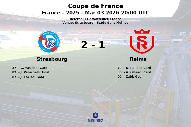 O Strasbourg avançou para a próxima fase da Coupe de France após uma partida intensa e disputada, com um total de 22 chutes (9 no alvo) em comparação com os 9 (2 no alvo) do Reims. A arbitragem de Eric Wattellier foi exigente, mostrando vários cartões amarelos em uma partida com um total de 15 faltas (5 do Strasbourg e 10 do Reims).