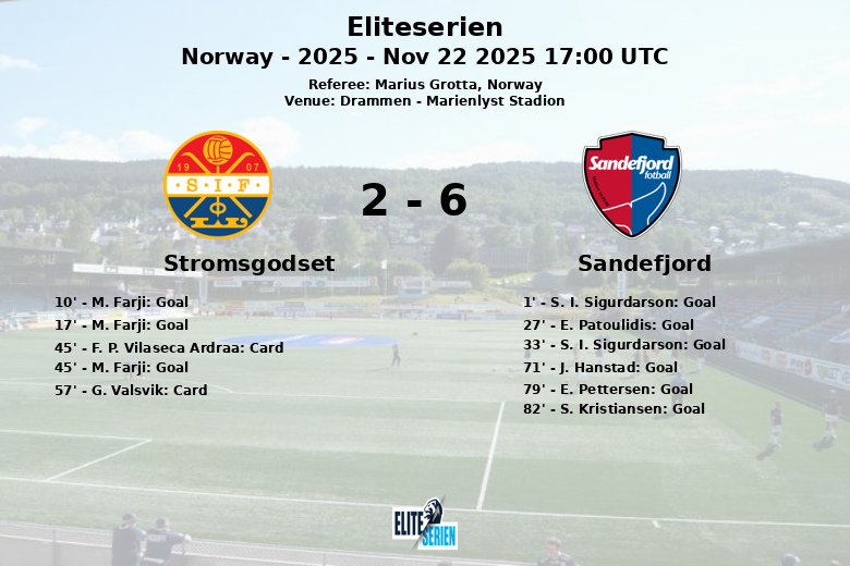 Drammen, Noruega – Em uma partida cheia de ação no Marienlyst Stadion, o Sandefjord derrotou o Stromsgodset de forma convincente com um placar final de 6-3. O encontro, correspondente à 29ª rodada da Eliteserien, foi um festival de gols desde o apito inicial.