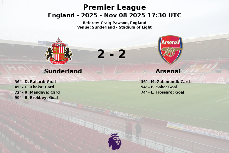 O Sunderland abriu o placar aos 36 minutos com um gol de D. Ballard, assistido por N. Mukiele. O Arsenal, no entanto, não demorou a reagir no segundo tempo. B. Saka igualou o marcador aos 54 minutos, com assistência de M. Merino. Posteriormente, L. Trossard colocou o Arsenal na frente aos 74 minutos, após um passe de M. Zubimendi. Quando parecia que os Gunners levariam a vitória, B. Brobbey empatou para o Sunderland aos 90 minutos, com uma assistência crucial de D. Ballard, selando o empate final.