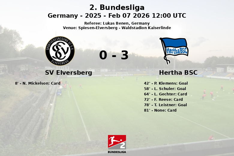 O Elversberg, embora tenha gerado um maior número de chutes (16 contra 6 do Hertha BSC), teve dificuldades em concretizar suas oportunidades, com apenas 4 chutes direcionados ao gol. O Hertha BSC, por sua vez, mostrou grande precisão, com 5 de seus 6 chutes indo na direção certa. A partida foi marcada por um jogo físico, com 10 faltas cometidas pelo Elversberg e 12 pelo Hertha BSC. N. Mickelson recebeu um cartão amarelo pelo Elversberg, enquanto L. Gechter e F. Reese foram advertidos pelo Hertha BSC. A partida foi realizada no Waldstadion Kaiserlinde sob o olhar atento do árbitro Lukas Benen.
