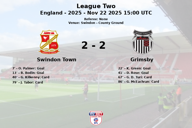 Swindon, Inglaterra – Um jogo vibrante no County Ground viu o Swindon Town e o Grimsby Town empatarem forças em uma partida cheia de ação que terminou em empate. O Swindon Town começou forte, abrindo uma vantagem rápida graças aos gols de O. Palmer aos 7 minutos, com assistência de J. Ball, e B. Bodin aos 13 minutos, com assistência de D. Oldaker. No entanto, o Grimsby respondeu com determinação. K. Green diminuiu a diferença aos 22 minutos, com assistência de C. Vernam, e D. Rose empatou de pênalti aos 41 minutos. A partida foi caracterizada por uma intensa batalha no meio-campo, refletida nos cartões amarelos mostrados a G. Kilkenny do Swindon Town aos 40 minutos, a G. D. Turi do Grimsby aos 67 minutos, a J. Tabor do Swindon Town aos 79 minutos e a G. McEachran do Grimsby aos 86 minutos. Apesar de dominar a posse de bola com 58%, o Grimsby não conseguiu converter sua superioridade em vantagem no placar. O Swindon Town, com 42% de posse de bola, mostrou eficiência em suas aproximações à área adversária. A partida terminou empatada, um resultado que reflete a competitividade do encontro.