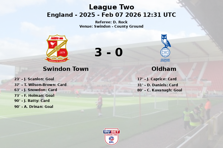 O Swindon Town demonstrou sua superioridade desde o início, abrindo o placar aos 23 minutos com um gol de J. Scanlon, assistido por A. Drinan. No entanto, a partida não foi isenta de tensão, com vários cartões amarelos mostrados para ambas as equipes, incluindo J. Caprice e D. Daniels pelo Oldham, e T. Wilson-Brown e J. Snowdon pelo Swindon.