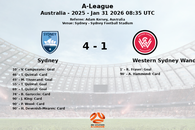 Sydney, Austrália – O Sydney FC dominou de forma convincente o derby da A-League contra o Western Sydney Wanderers no Sydney Football Stadium, com um placar final que reflete sua superioridade em campo. A partida, apitada pelo árbitro Adam Kersey, ofereceu momentos de alta tensão e gols espetaculares.