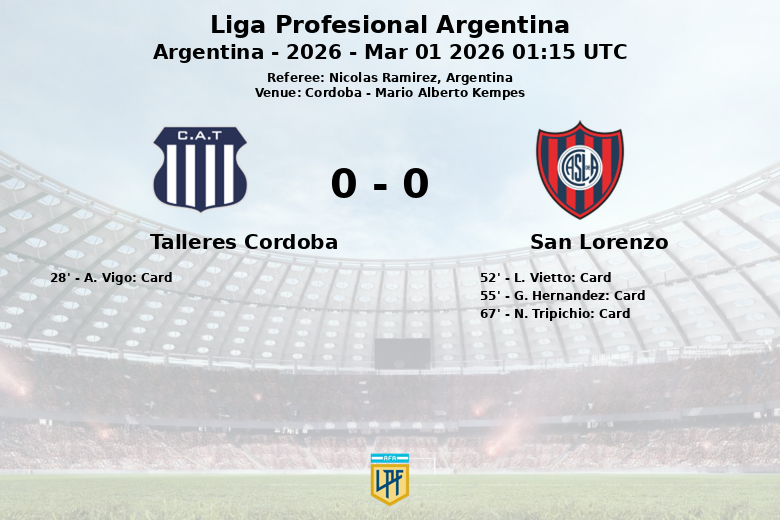 A partida foi marcada por um alto número de faltas, com 12 cometidas pelo Talleres e 10 pelo San Lorenzo. O árbitro mostrou um cartão amarelo para um jogador do Talleres e três para jogadores do San Lorenzo. Apesar do domínio territorial do Talleres, o San Lorenzo conseguiu gerar perigo no ataque com 6 escanteios.