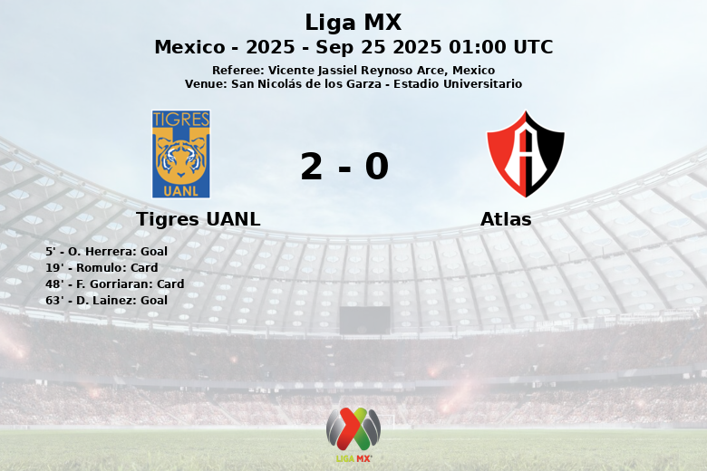 No segundo tempo, D. Lainez ampliou a vantagem do Tigres aos 63 minutos, consolidando o domínio da equipe. Embora o Atlas tenha procurado criar perigo, conseguiu apenas 2 chutes a gol de 7 tentativas no total. O Tigres, por sua vez, mostrou maior eficácia com 7 chutes a gol de 16 tentativas. A partida, arbitrada por Vicente Jassiel Reynoso Arce, culminou com uma vitória para o Tigres, demonstrando sua superioridade em campo durante a partida correspondente à 10ª jornada do Apertura 2025 da Liga MX. Os felinos executaram 7 escanteios enquanto as raposas 6.