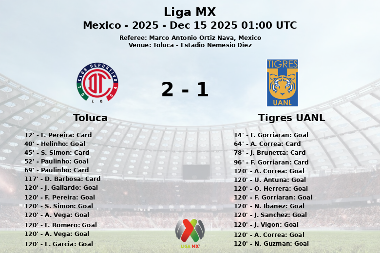 O Tigres abriu o placar logo no início, com um gol de F. Gorriaran aos 14 minutos, assistido por A. Gignac. No entanto, o Toluca respondeu com força. Helinho empatou a partida aos 40 minutos, com assistência de F. Romero, dando esperança à torcida local. O segundo tempo viu o Toluca assumir a liderança aos 52 minutos com um gol de Paulinho, assistido por Helinho, levando o placar para 2-1.