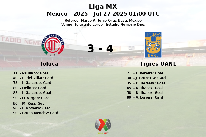 Toluca de Lerdo, México – Em um jogo repleto de emoção e gols, Toluca e Tigres UANL se enfrentaram no Estádio Nemesio Díez, em partida válida pela 3ª rodada do Apertura da Liga MX 2025. A partida, apitada por Marco Antonio Ortiz Nava, deixou os torcedores à beira de seus assentos.