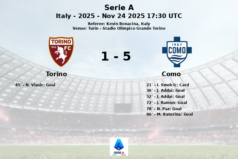 No entanto, o segundo tempo foi um monólogo do Como. J. Addai marcou novamente aos 52 minutos, novamente com assistência de J. Rodriguez. Posteriormente, J. Ramon (72′) e N. Paz (78′), ambos assistidos por M. Perrone, ampliaram a vantagem. Para selar a vitória, M. Baturina marcou aos 86 minutos, consolidando o triunfo dos visitantes.