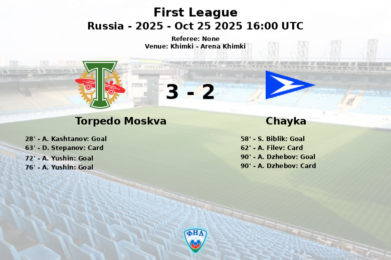 Khimki, Rússia – Em uma partida disputada na Arena Khimki, o Torpedo Moscou saiu vitorioso contra o Chayka em um jogo cheio de reviravoltas. A partida, válida pela 16ª rodada da First League, temporada de 2025, proporcionou um espetáculo emocionante para os torcedores presentes.