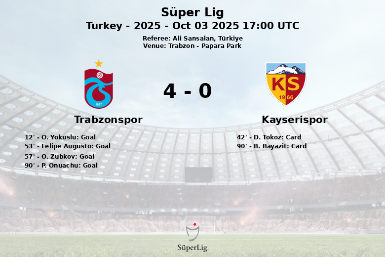 Trabzon, Turquia – Em uma partida realizada no Papara Park, o Trabzonspor derrotou claramente o Kayserispor com um placar final de 4 a 0. A equipe da casa controlou a posse de bola com 52% e demonstrou sua superioridade ofensiva ao longo da partida.