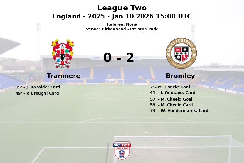 O atacante M. Cheek emergiu como a figura-chave da partida, marcando dois gols cruciais. O primeiro gol aconteceu logo no início, aos 2 minutos, com uma jogada bem elaborada e uma assistência de M. Pinnock. O Tranmere procurou reagir, mas seu jogo foi interrompido por faltas constantes e um cartão amarelo precoce para J. Ironside aos 15 minutos. O Bromley também recebeu cartões, com I. Odutayo e, posteriormente, o próprio Cheek recebendo cartões amarelos.