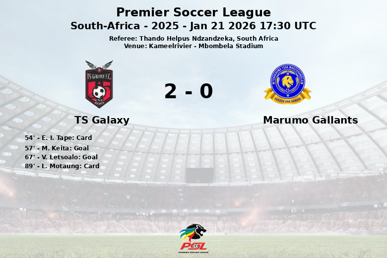 Kameelrivier, África do Sul – Em uma partida disputada no Estádio Mbombela, o TS Galaxy garantiu uma vitória suada contra o Marumo Gallants na 15ª rodada da Premier Soccer League. A partida, apitada por Thando Helpus Ndzandzeka, foi caracterizada por sua intensidade e jogo físico.