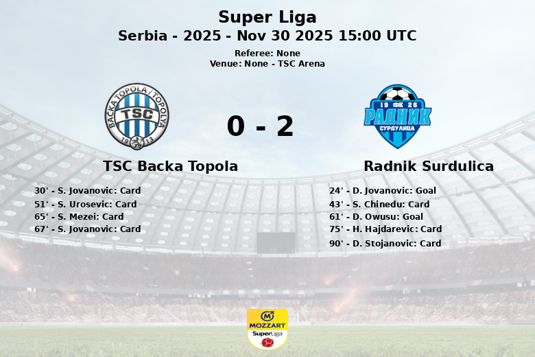 Numa partida disputada na TSC Arena, o Radnik Surdulica alcançou uma vitória inesperada sobre o TSC Backa Topola, apesar de ter uma posse de bola significativamente menor (30% contra 70%). O jogo, válido pela 17ª jornada da Super Liga sérvia, foi marcado pela intensidade e pelas numerosas faltas cometidas por ambas as equipas.