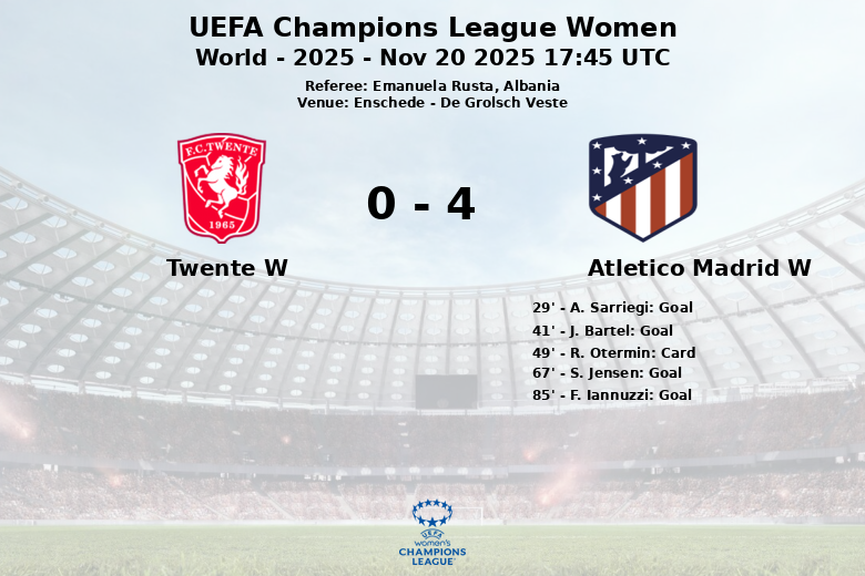 Num jogo disputado em Enschede, o Atlético de Madrid Feminino demonstrou a sua superioridade ao vencer o Twente com uma exibição dominante. O jogo, correspondente à fase de grupos da Liga dos Campeões Feminina da UEFA, terminou com uma clara vitória para a equipa espanhola.